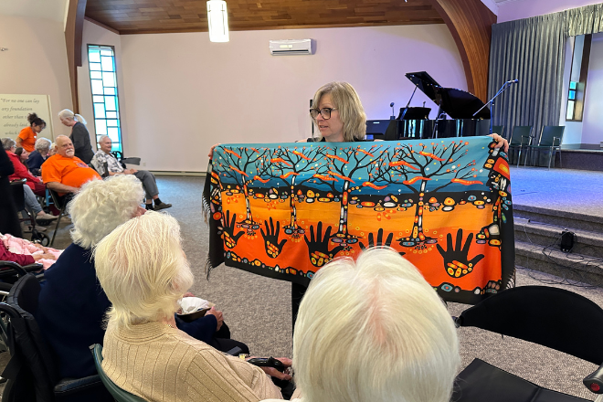 Menno Place hosted Bridget Finley, MCC BC Indigenous Neighbours Coordinator who gave a presentation for all residents, families and staff to honour the National Day for Truth and Reconciliation. Bridget spoke with us about what Jesus taught us about what it means to be a good neighbour in Matthew 22:39, “You shall love your neighbor as yourself.”