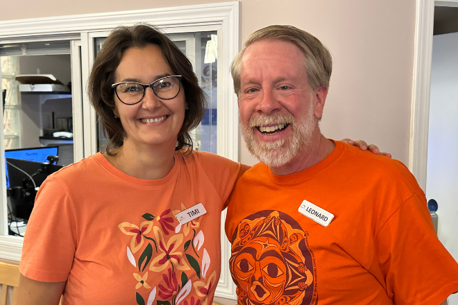Linda Weatherly (L), Manager, Recreation and Volunteers and Bridget Findlay (R) MCCBC Indigenous Neighbours Coordinator share stories at the Menno Place Truth and Reconciliation gathering.