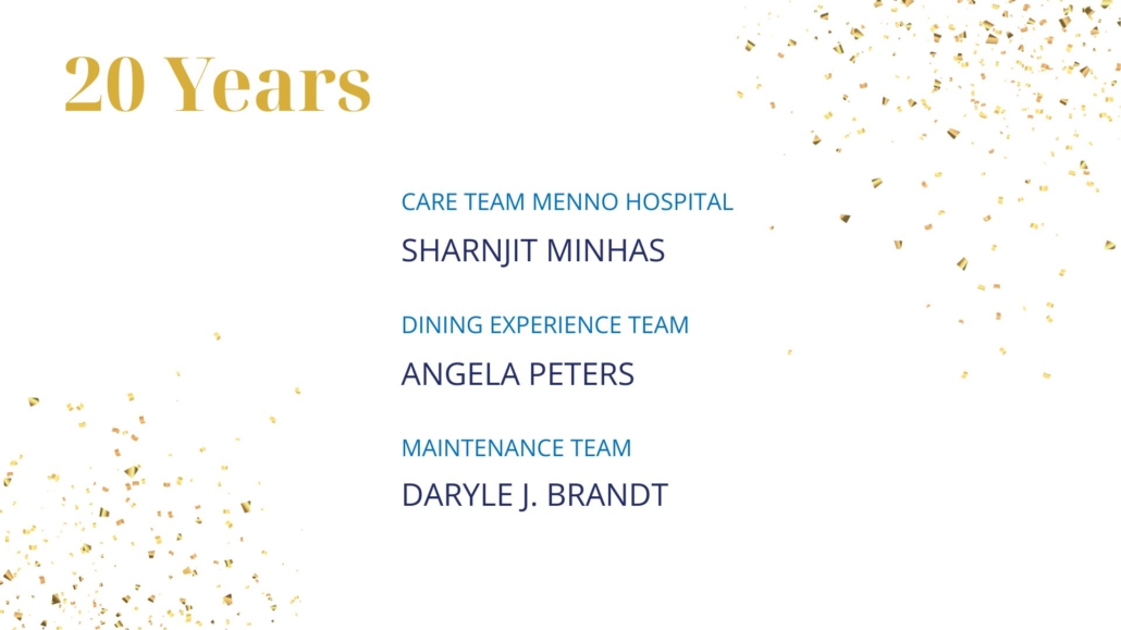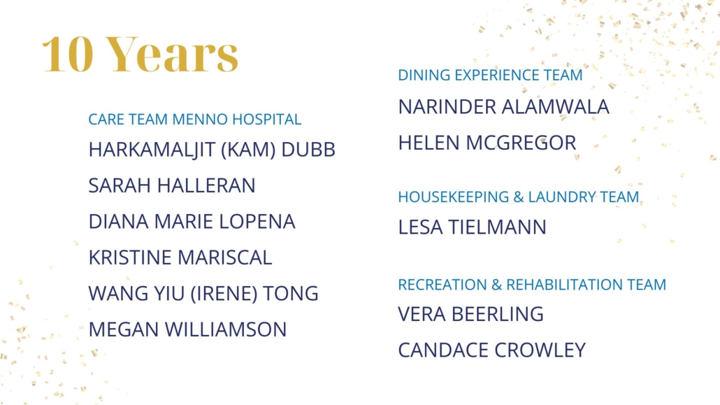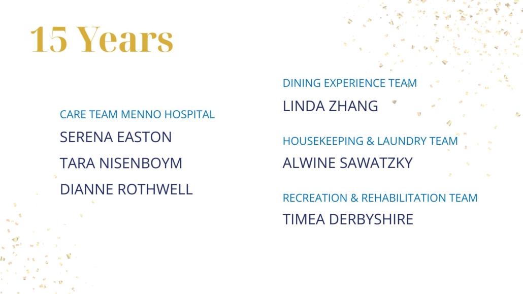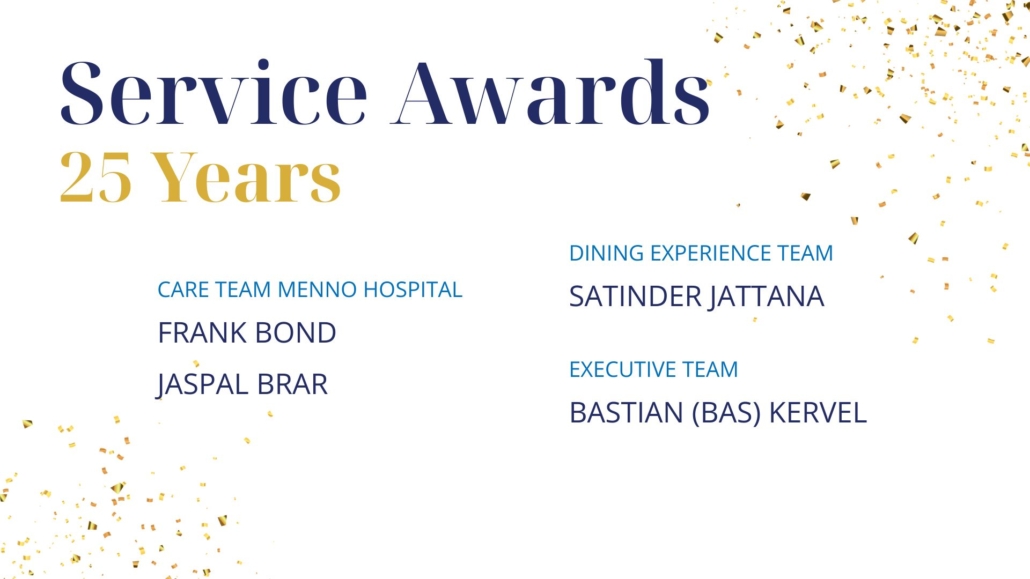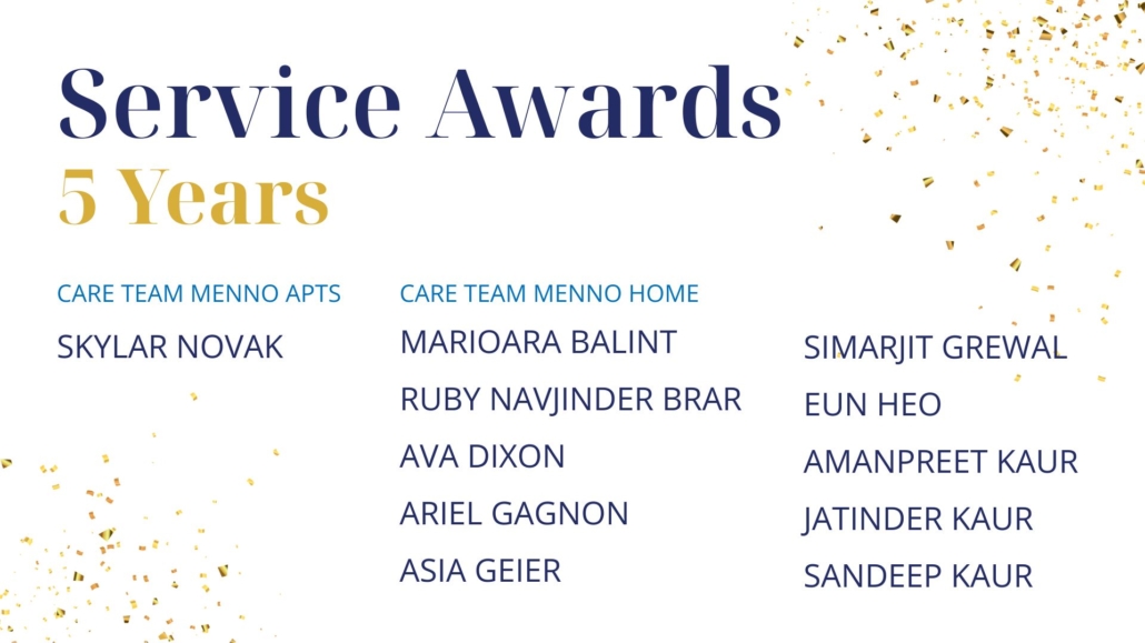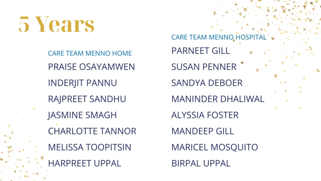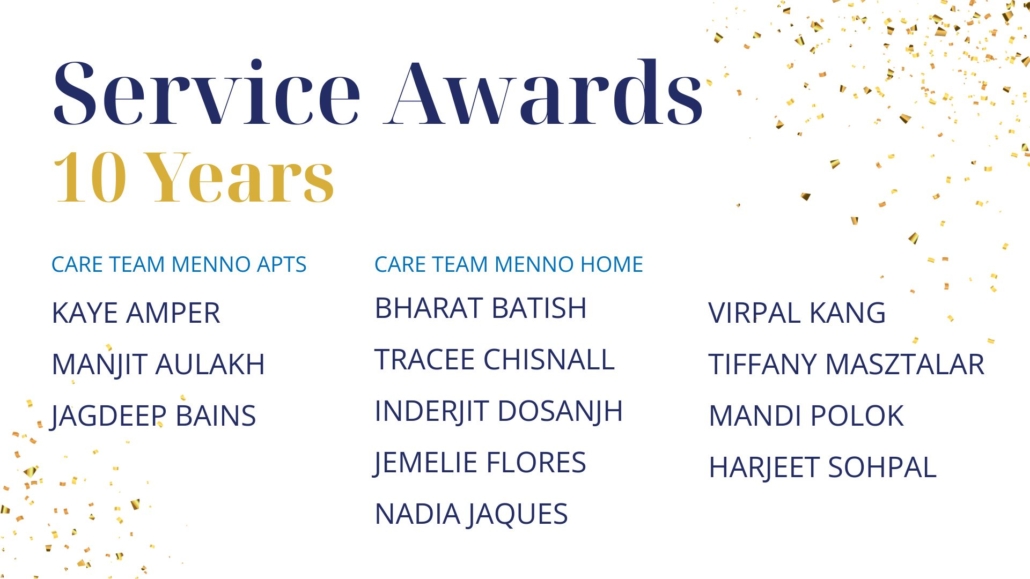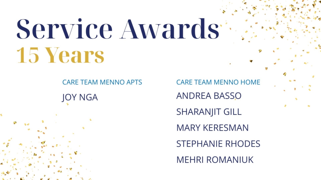 As Sujata Connors shared in closing, “We know that God is here at Menno Place. I see it every single day. Thank you for continuing to work here and support our mission to provide wonderful, compassionate, Christian care for our residents and for each other.”