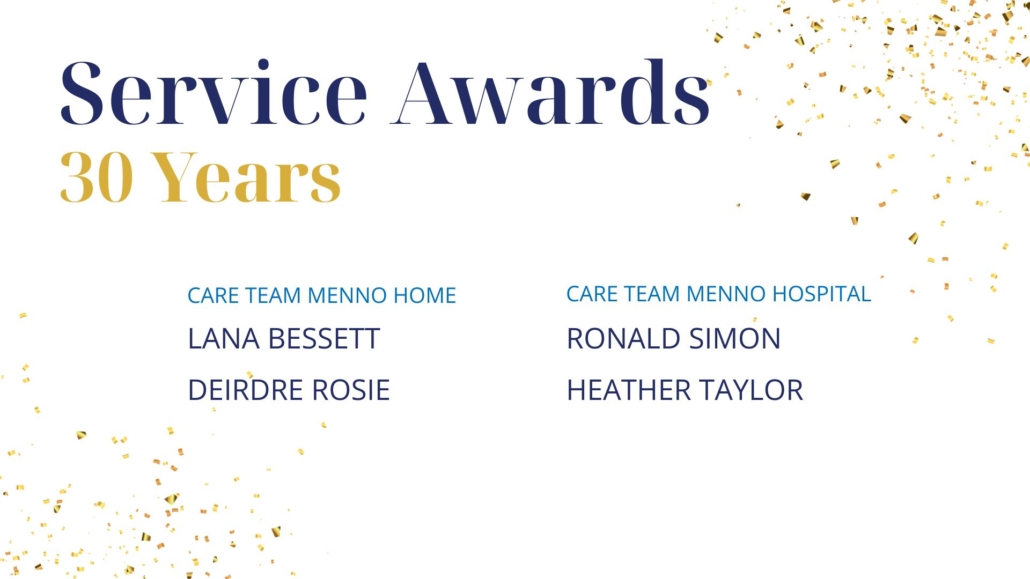 Four members of the care team were recognized for 30 years of service in Menno Home and Menno Hospital and each one was recognized by their manager: