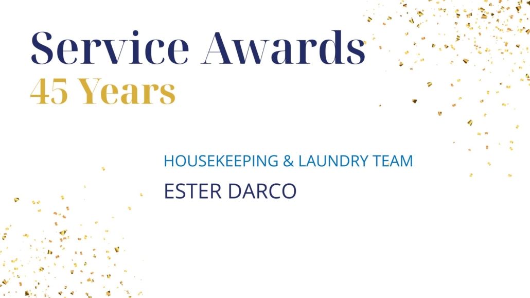 Our 45-year honouree, Ester Darco, joined the Housekeeping and Laundry team back in 1981. Nik Van Egdom, Manager of Environmental Services, described Ester as “a wonderful housekeeper who goes out of her way to make sure the residents feel loved.”
