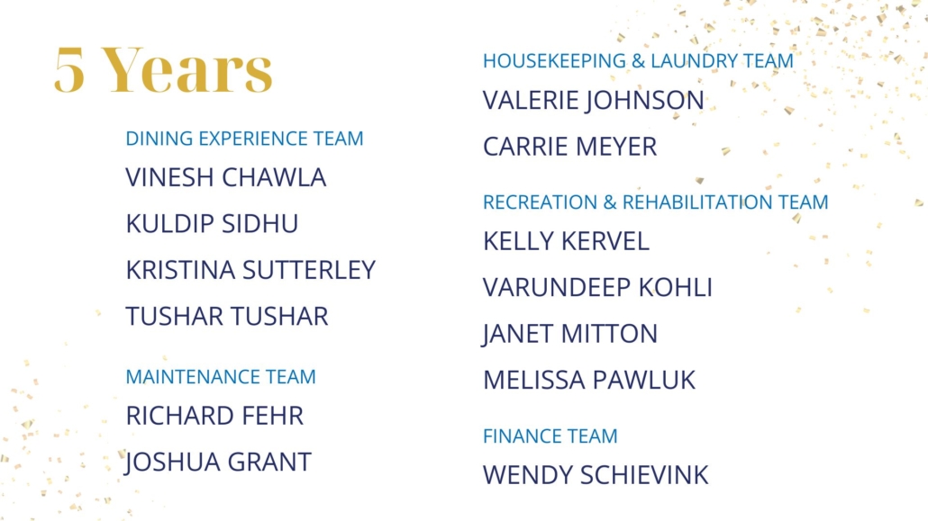 This year 94 staff members were recognized, including special honours for four staff reaching 30 years of service, one reaching 40 years, and one reaching an extraordinary 45 years with Menno Place. Altogether the 94 staff members represent a remarkable 1,076 combined years of service—a legacy of care, consistency, and commitment that has touched thousands of lives.